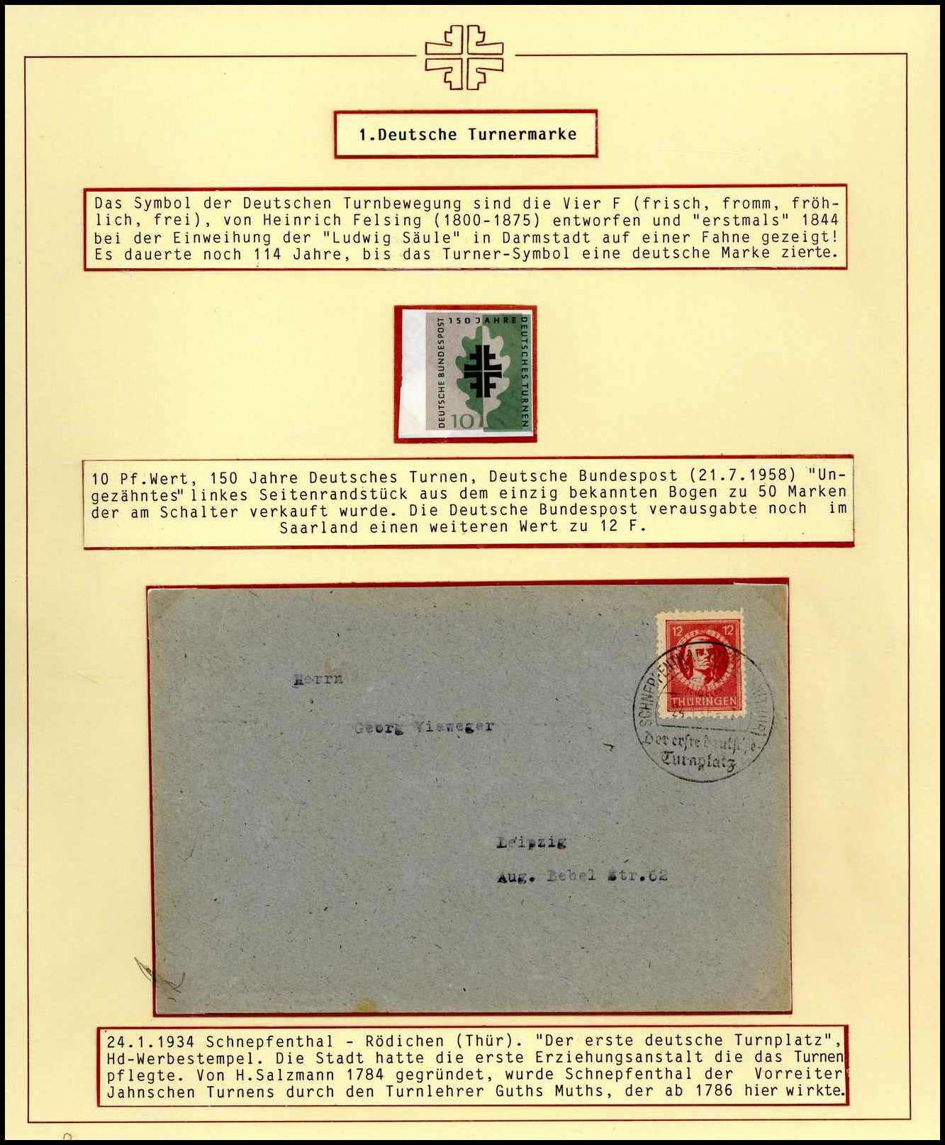 8347 imageDEUTSCHES TURNFEST - ausstellungsmässig aufgezogene Sammlung in elf Alben, dabei z.B. der erste deutsche Sonderstempel zum III. Turnfest in Leipzig 1863, div. weitere frühe Sonderstempel, aber auch moderne Raritäten wie die ungezähnte Variante der bundesdeutschen Sondermarke von 1958. Frühe, seltene Litho-Privatganzsachen, Sportmarken (z.B. Griechenland 1896) aber auch moderne Autogramme ergeben ein lohnenswertes Objekt