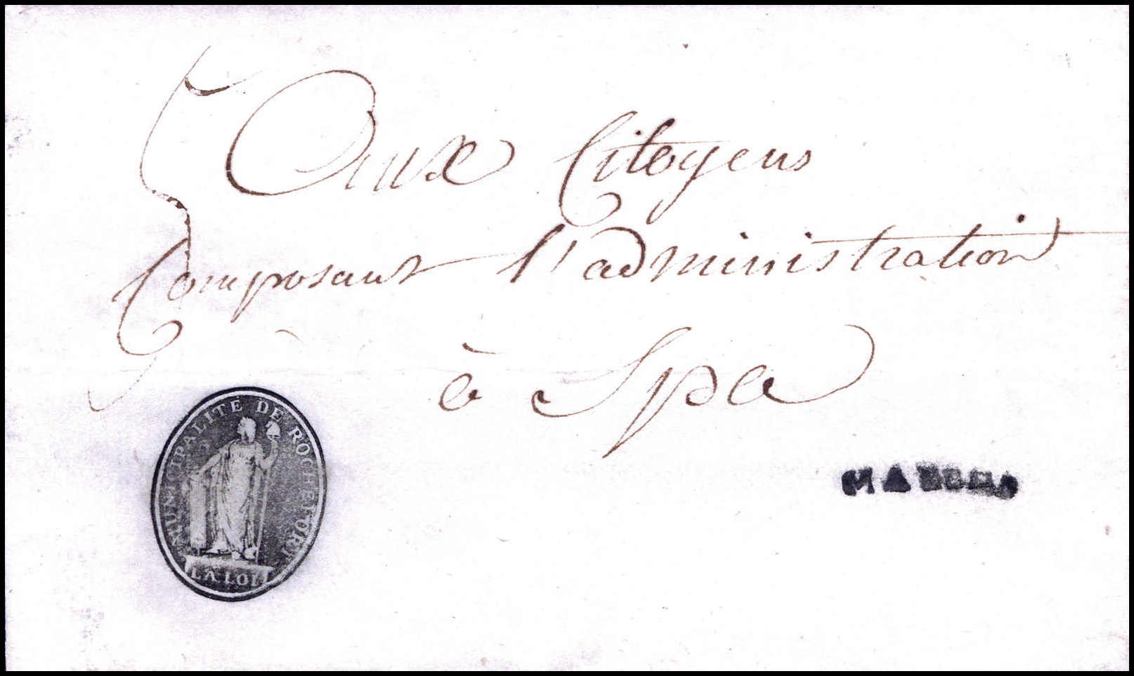 UNTER FRANKREICH, 16/7 1795, L1 MARCHE (Stempel aus Habsburger Zeit) unten rechts auf vollst. Faltbrief mit Absenderstempel der MUNICIPALITE DE ROCHEFORT (auch innen) nach Spa. Eine bei Goebel noch nicht verzeichnete Verwendung des alten