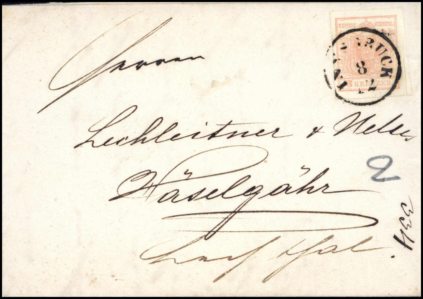 Brief ins Lechtal: 3 Kr., frischer weißer Luxusbrief mit K1 INNSBRUCK 8/12 (1857) nach Häselgähr. Mit hs. Botenlohnvermerk "2". Derartige Briefe mit Sonderbeförderungsgebühr ins Lechtal sind sehr selten (Fe. 350,-)