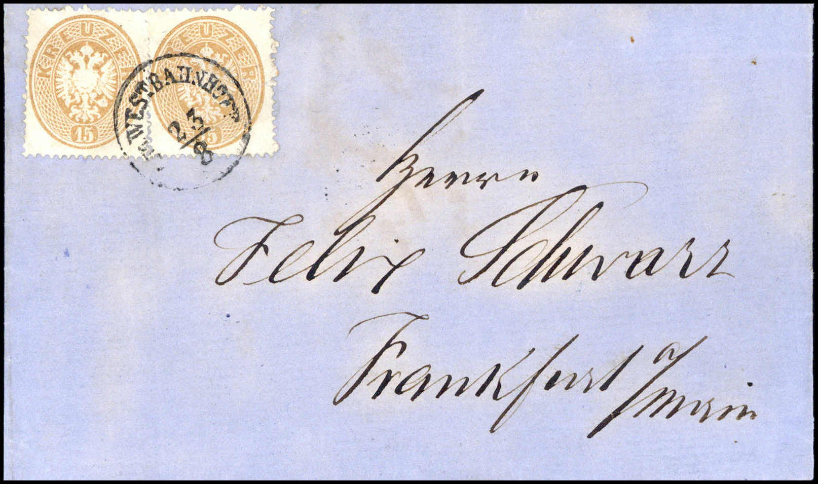 15 Kr., zwei Exemplare mit K1 WESTBAHNHOFE auf Kabinettbrief nach Frankfurt/M
