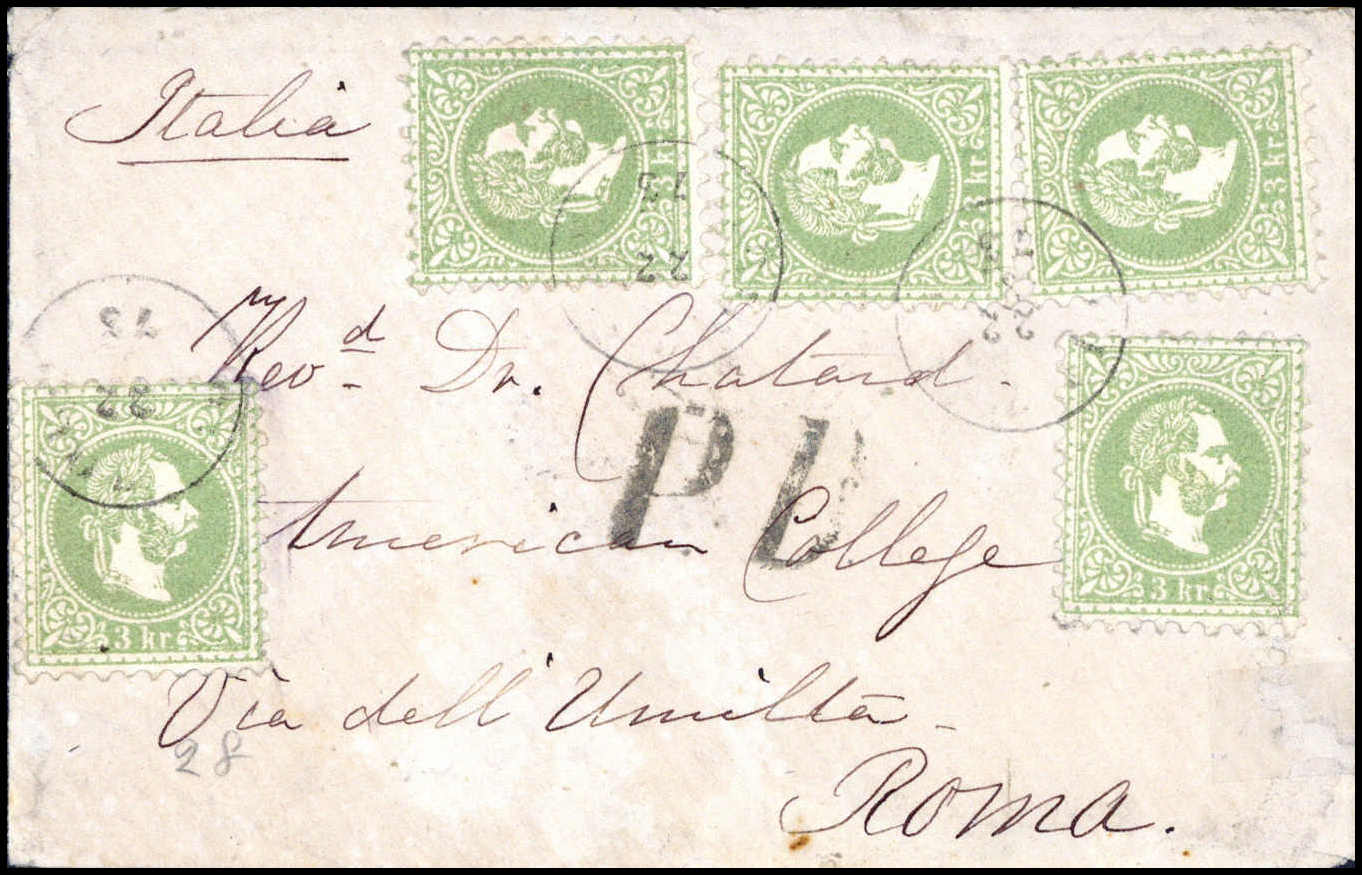 3 Kr., fünf Exemplare auf schönem kl. Brief nach Rom, rs. fünf verschied. Stempel