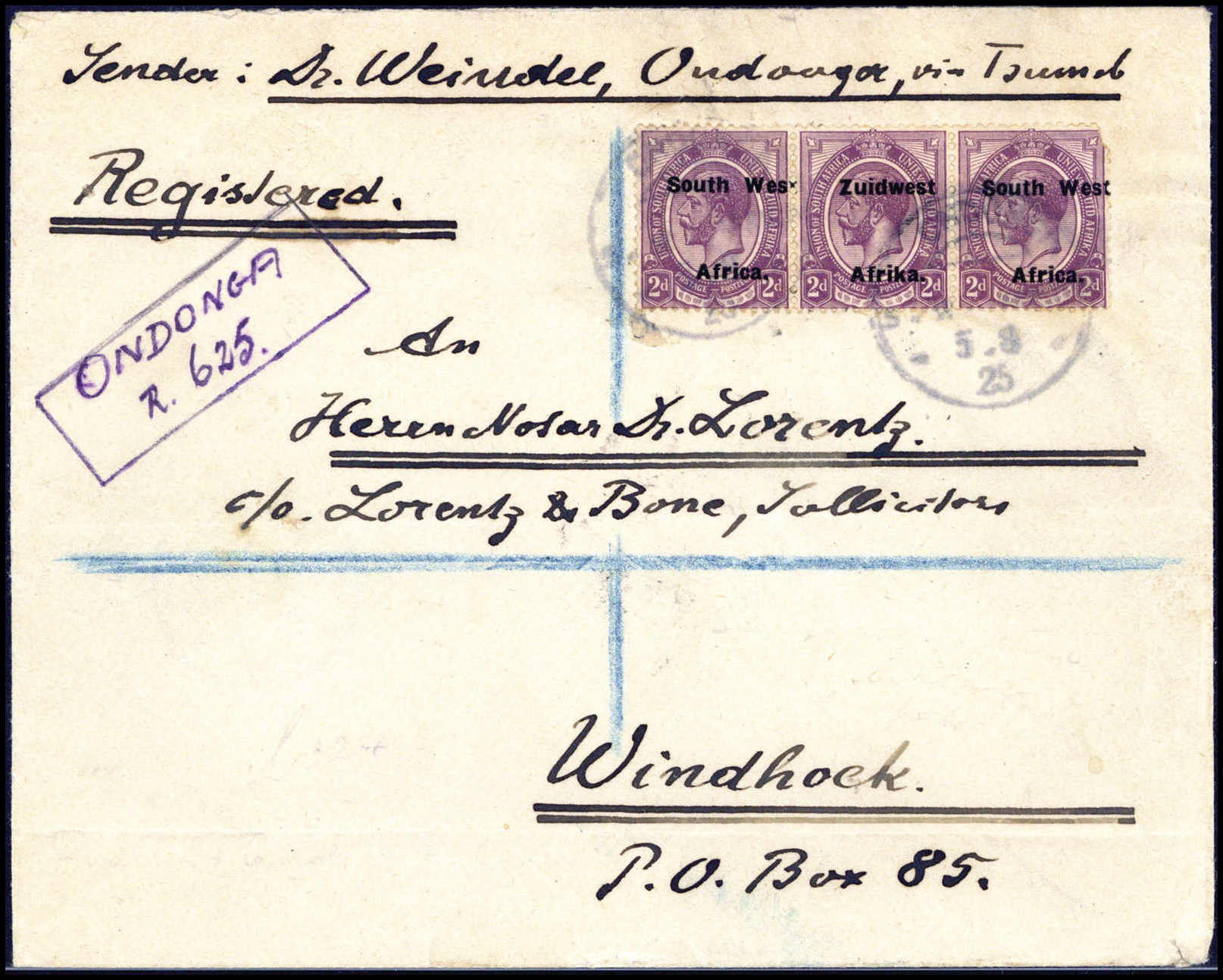 ONDONGA aptiert, 5/8/25, recht deutlich für diese Abstempelung auf waagerechtem Dreierstreifen 2d. (Eckzahn oben rechts kurz) auf eingeschriebenem Umschlag mit hds. R-Zettel nach Windhoek