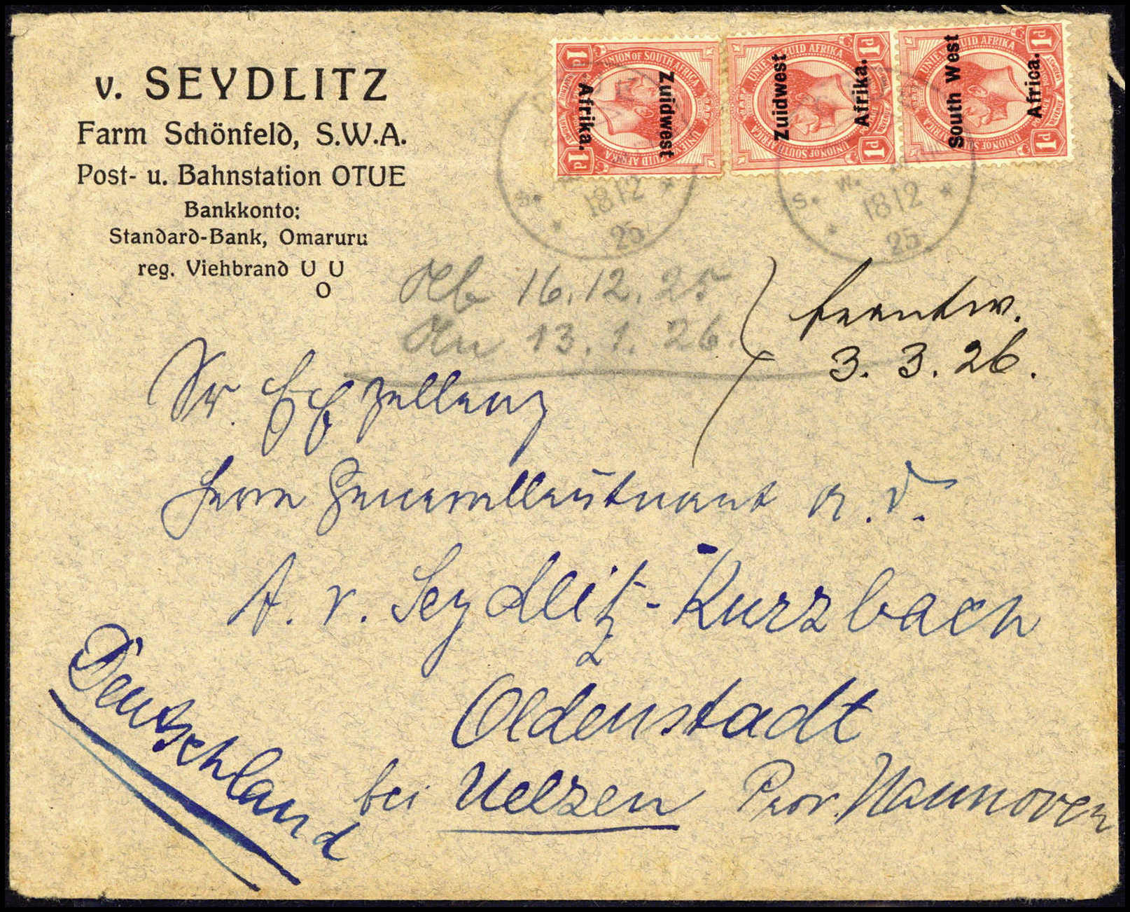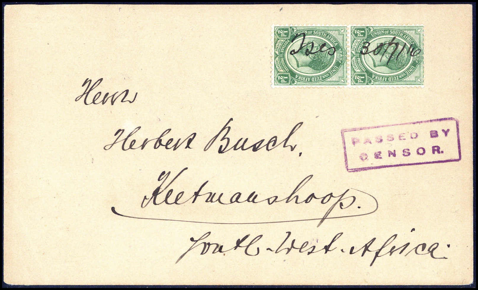 "Tses 30/7/16" in Tinte auf senkr. Paar 1/2 d. auf zensiertem Umschlag nach Keetmanshoop. Eine sehr seltene handschriftliche Entwertung
