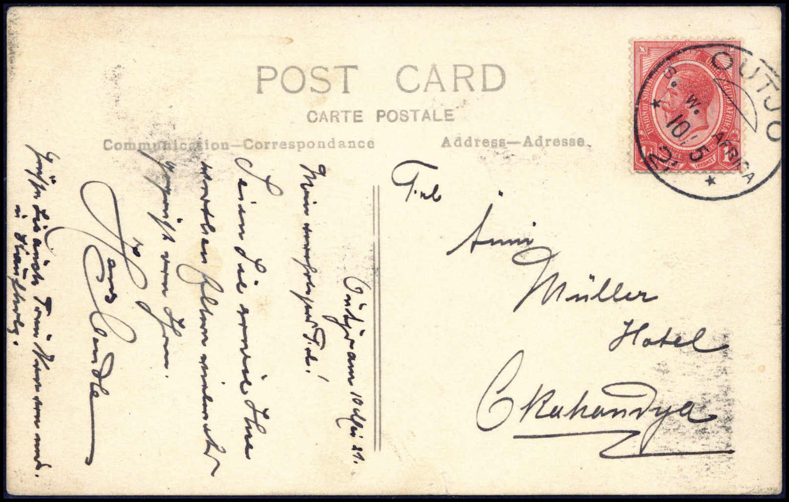 OUTJO Sehnenstempel, aptiert, 10/5/21 perfekt auf Ansichtskarte mit 1 d. nach Okahandja. Seltener Stempel