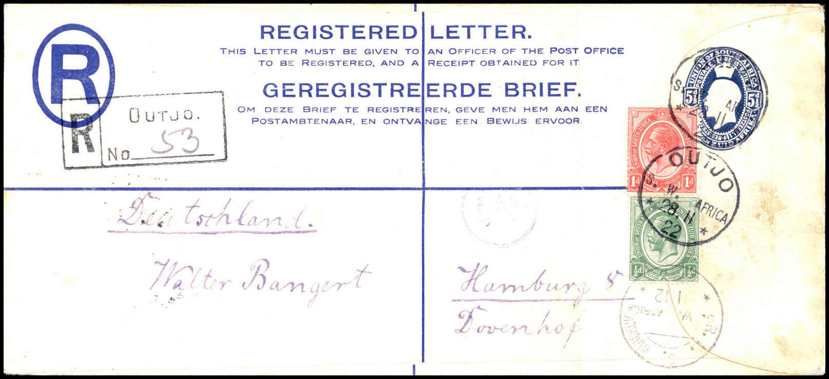 OUTJO, aptiert, 28/11/22, zweimal schön auf R-Ganzsachenumschlag 5 1/2 d. grosses Format (rechts senkr. Falte) mit 1/2 d. und 1 d. nach Hamburg. Seltene, frühe Post nach Deutschland