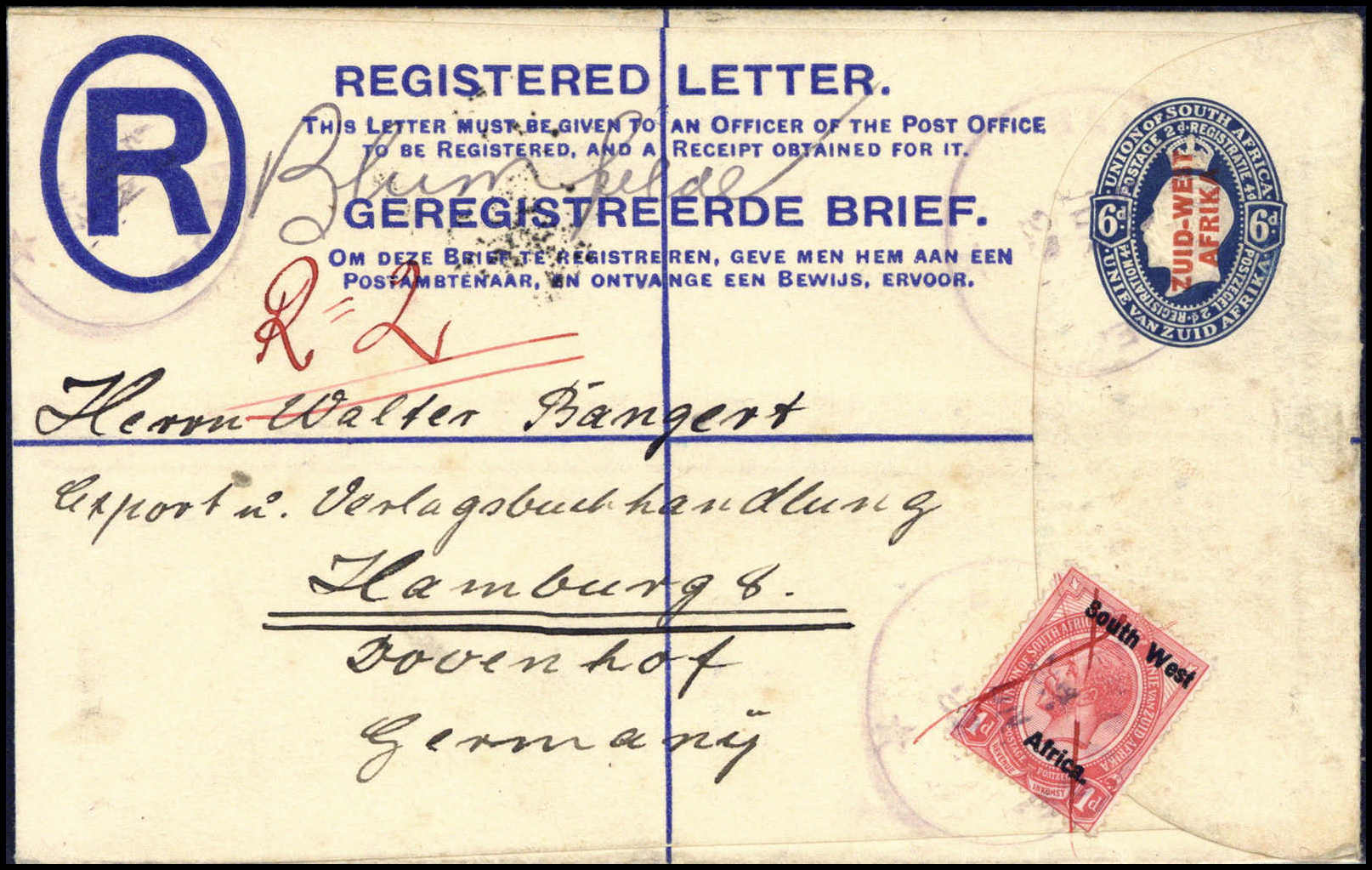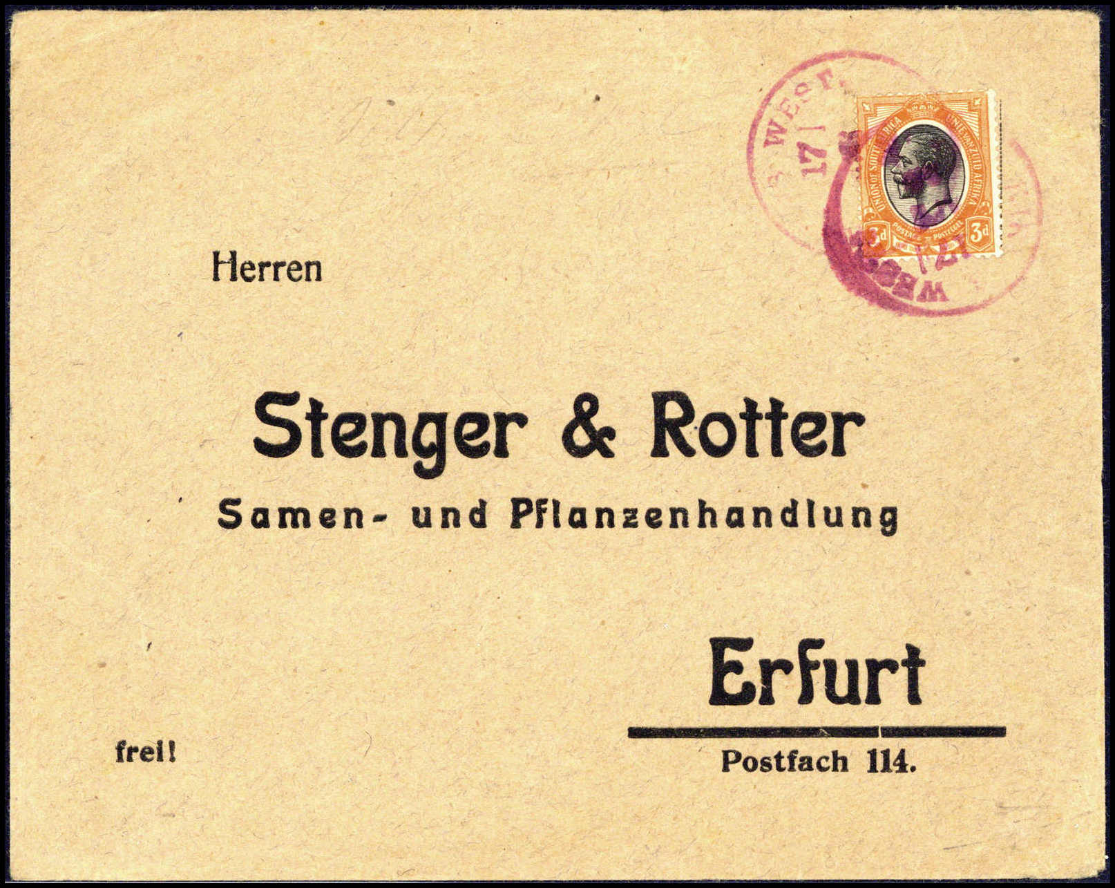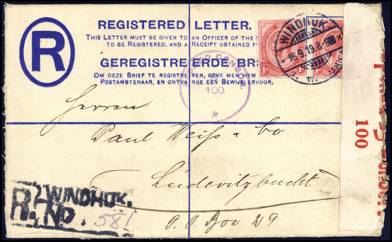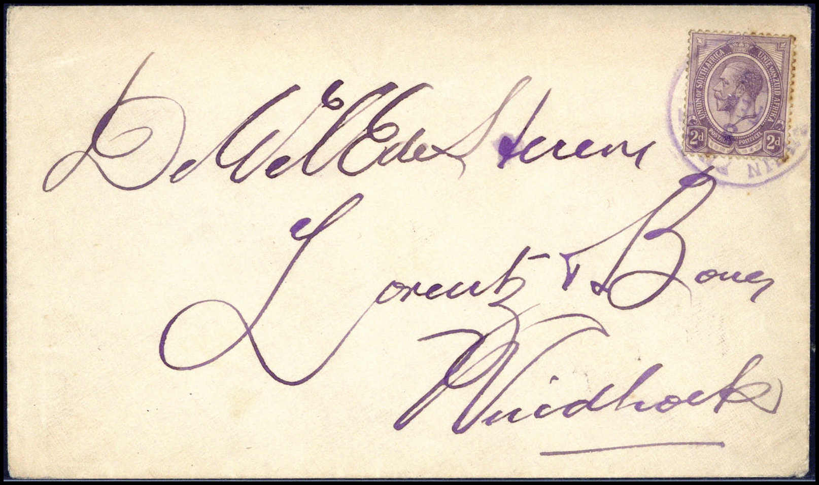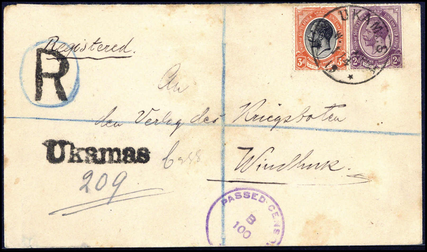 UKAMAS, aptiert, 1/4/19 auf zensiertem R-Umschlag mit 2 d. und 3 d. (kleine Schürfung oben) nach Windhuk. Schöner Brief mit ungewöhnlichem Stempel