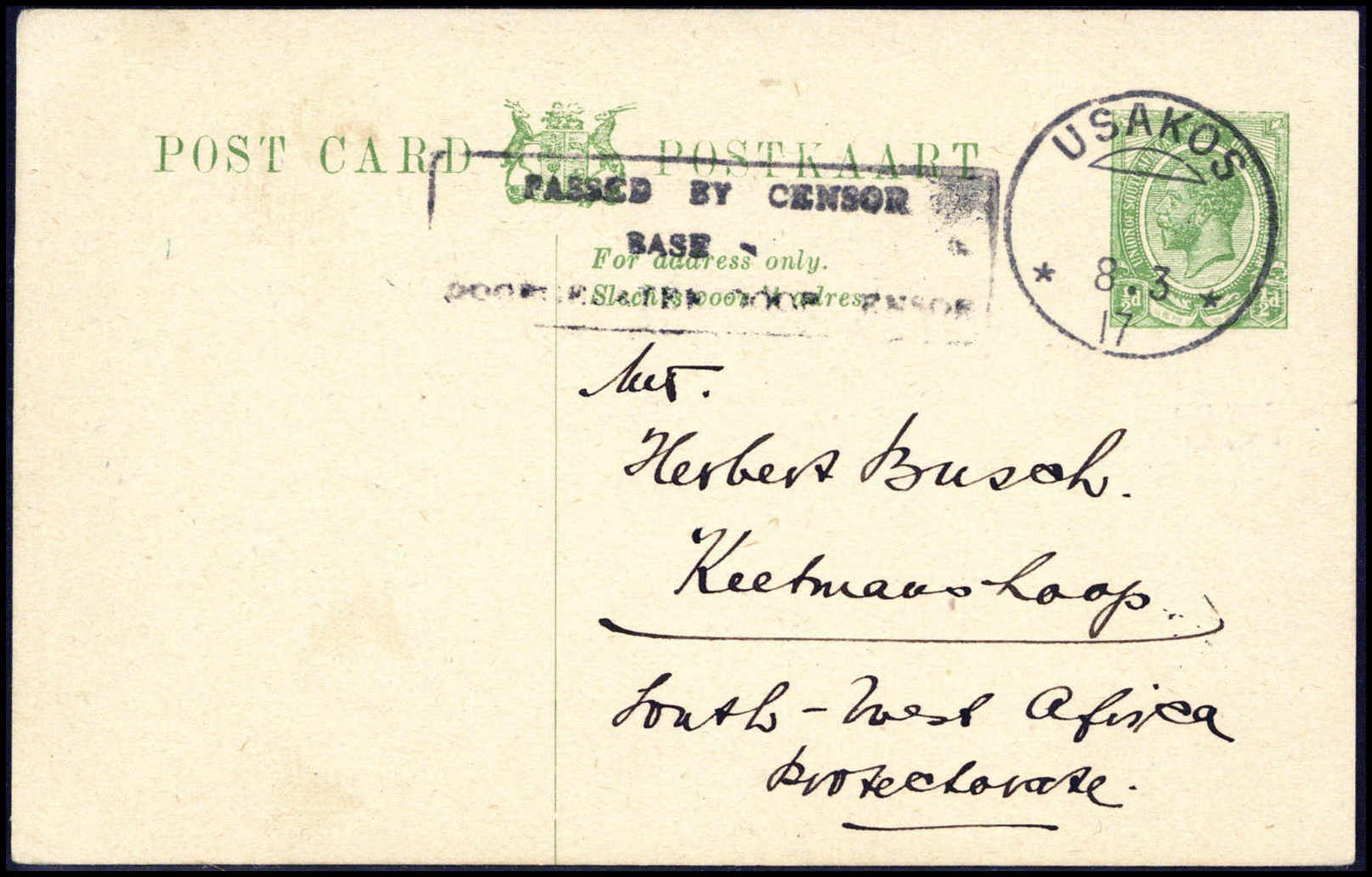 USAKOS, Sehnenstempel aptiert, 8/3/17, perfekt auf zensierter Postkarte 1/2 d. nach Keetmanshoop