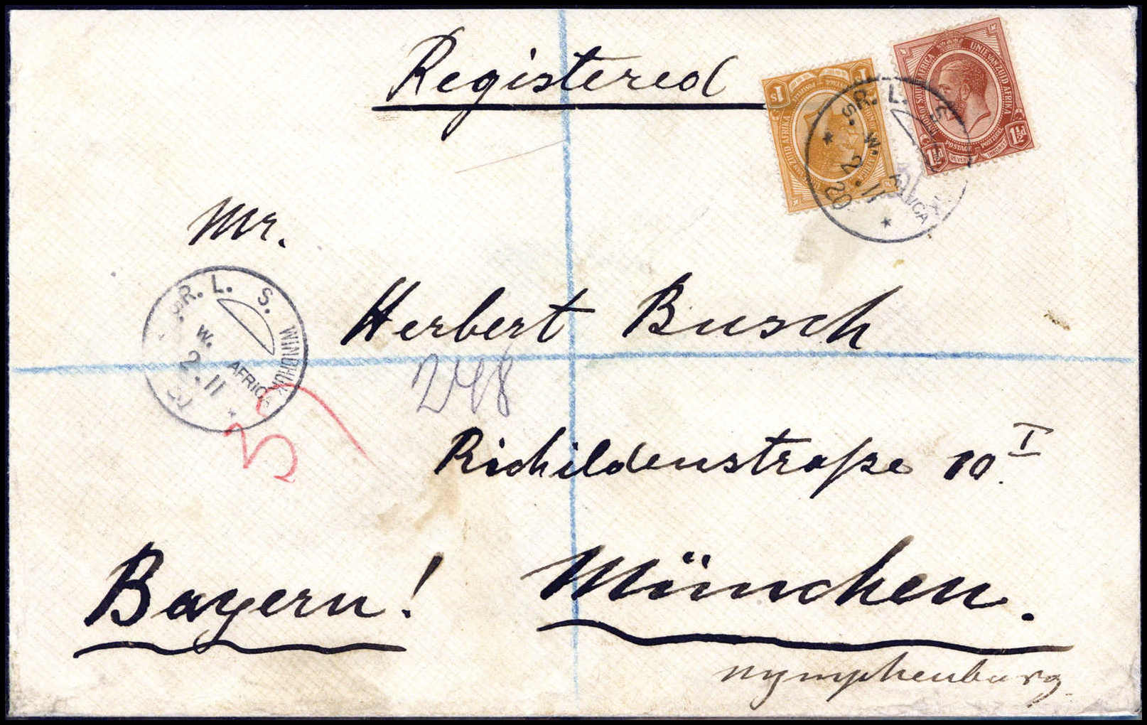 WINDHUK R.L.S., aptierter Sehnenstempel auf eingeschriebenem Brief (190 x 120 mm.) mit 1 1/2 d. und 1 s. nach München. Korrekt verwendet sehr selten. Provenance: White Lady I