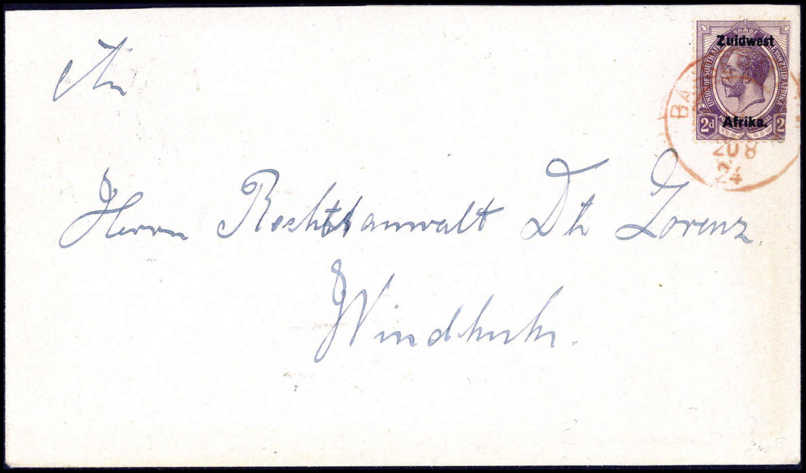 BASSERMANN, rot, Deutsche Stempeltype, 20/8/24 fast vollständig auf 2 d. (rechts abgeschnitten) auf Bedarfsbrief nach Windhuk. Insbesondere rot sehr selten