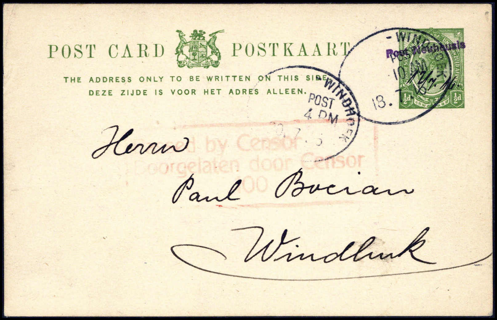 "Post Neuheusis" violetter Einzeiler mit hds. Datum in Tinte "12/7.16" auf zensierter 1/2 d. Postkarte nach Windhoek mit ovaler Nachentwertung über Entwertung wie üblich. Seltener provisorischer Stempel
