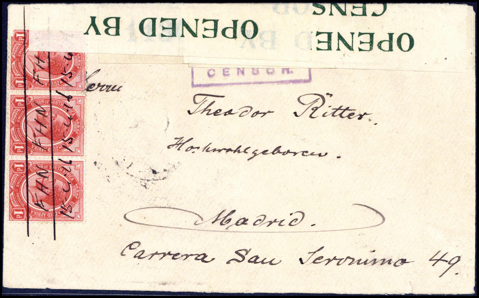 "FHN" zwischen zwei Strichen mit Datum "15-4-16", Tintenentwertung über Dreierstreifen 1 d. (erste Marke Ecke unten links wenig defekt) auf dreifach zensiertem Umschlag nach Madrid mit Ankunftsstempel rücks. Ein aussergewöhnlicher Brief
