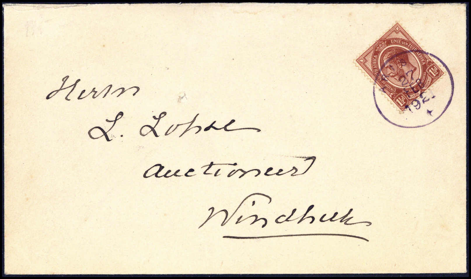 "ARIS 27 FEB 1921", violetter Gummi K1 perfekt auf 1 1/2 d. auf Bedarfsbrief nach Windhuk. Sehr seltene Entwertung