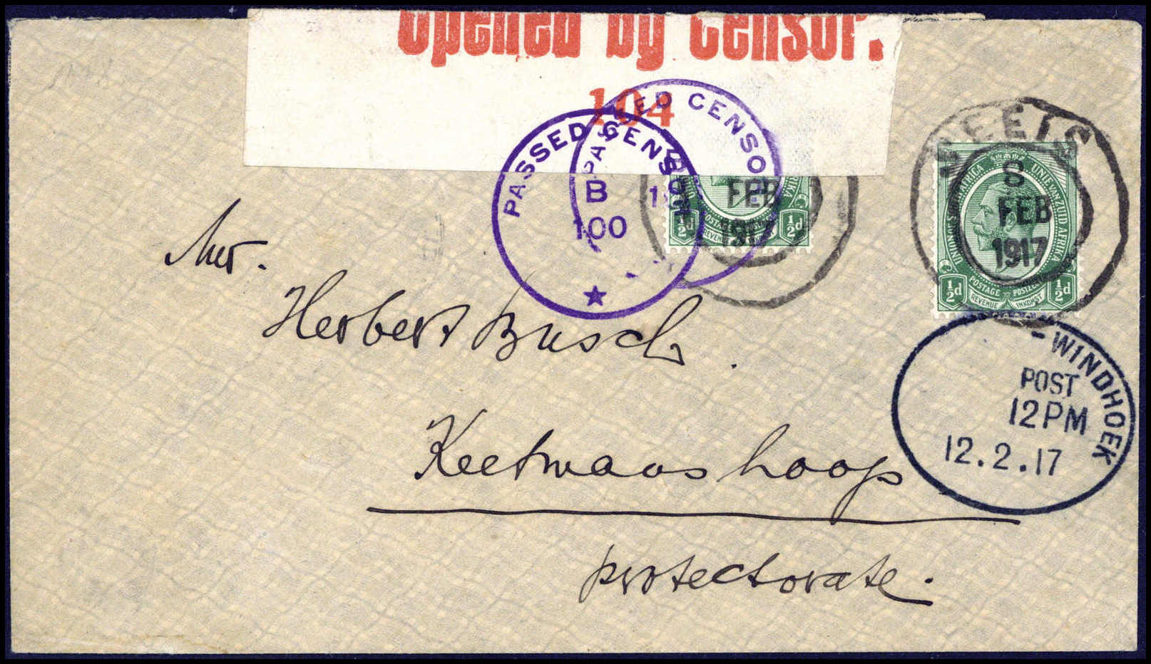 "SEEIS 8 FEB 1917", Gummi K2 perfekt auf zwei 1/2 d. auf zensiertem Umschlag nach Keetmanshoop. Seltene Entwertung