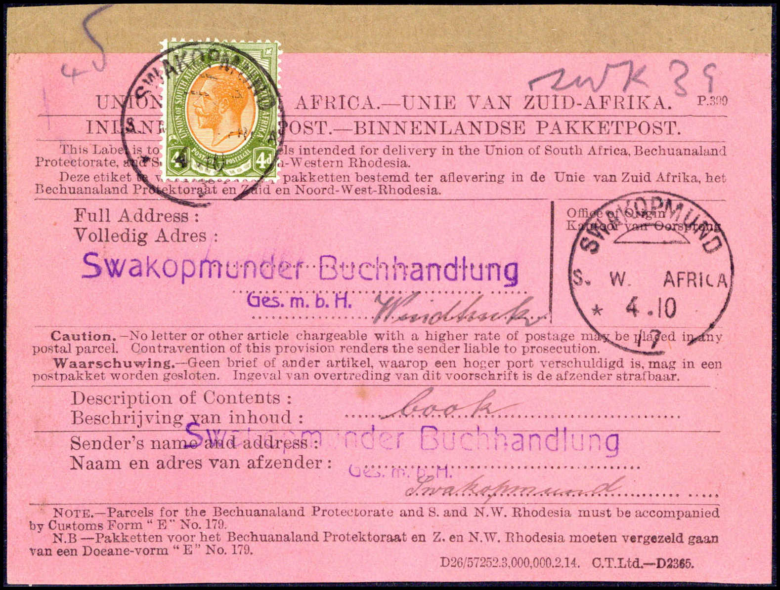 SWAKOPMUND, aptierter Sehnenstempel 4/10/17 auf 4d. auf vollständiger, rosa Paketadresse nach Windhuk