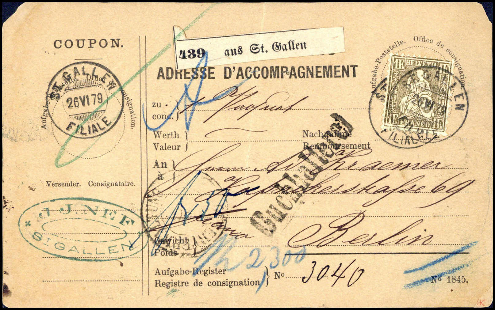 1 Fr., Einzelfrankatur auf Paketkarte nach Berlin, klare Stempel ST.GALLEN 26/6 79 (leichte Beförd.-Spuren)