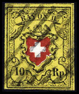 10 Rp., besonders breitrandiges Luxusstück mit zentr. klar aufges., breitliniger Raute, Fotoattest Eichele. (SBK 16II)