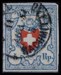 5 Rp. dunkelblau, ohne KE, Abart: Doppeldruck der Farbe Zinnoberrot, außergewöhnlich farbfrisches und ringsum breitrandiges Exemplar mit seltener roter Tinten-Entwertung. Altschweiz-Rarität, Fotoattest Eichele SBPV (SBK 15II.1.06). Katalogpreis: 4.000,-