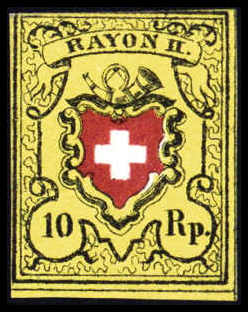 10 Rp., Abart: sehr dickes Papier, leuchtend farbfrisches, ungebrauchtes Exemplar o.G. (oben etwas berührt). In ungebrauchter Erhaltung sind nur ganz wenige Stücke dieser Abart bekannt, Fotobefund Eichele. Katalogpreis: (2.500,-)