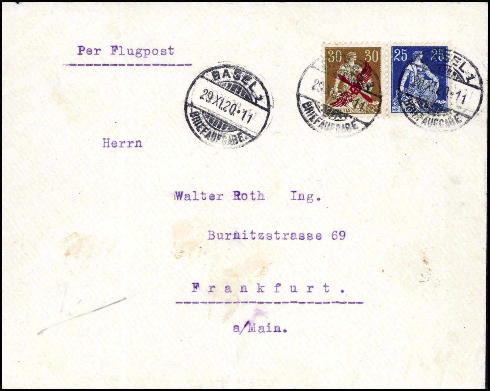 30 C. mit 25 C. auf vermutl. regulär per Luftpost befördertem Brief mit Stempel BASEL 29/11 20 nach Frankfurt/M. (leichte Gebrauchsspuren). Katalogpreis: 2.000,-