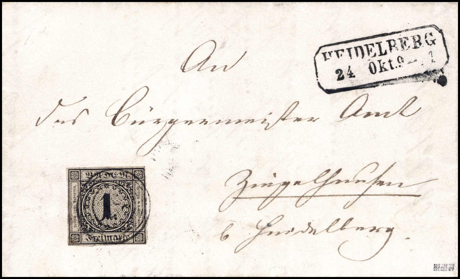1 Kr., bis auf winz. Stelle ringsum vollrandige Einzelfrankatur auf schönem weißen Brief mit zentr. Stempel "57" HEIDELBERG im Ortszustellbereich gelaufen, doppelt sign. Seeger BPP. Katalogpreis: 2.200,-