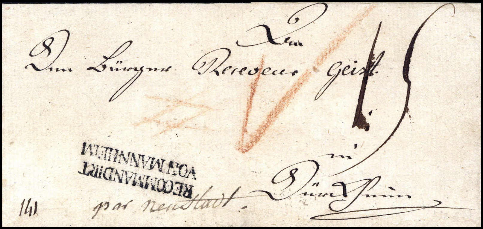 (1799), RECOMMANDIRT VON MANNHEIM, vorzüglich klarer L2 auf austaxierter Pracht-Briefhülle (Wasserzeichen von 1798) nach Dürkheim. Eine große Stempel-Seltenheit in vorzüglicher Qualität