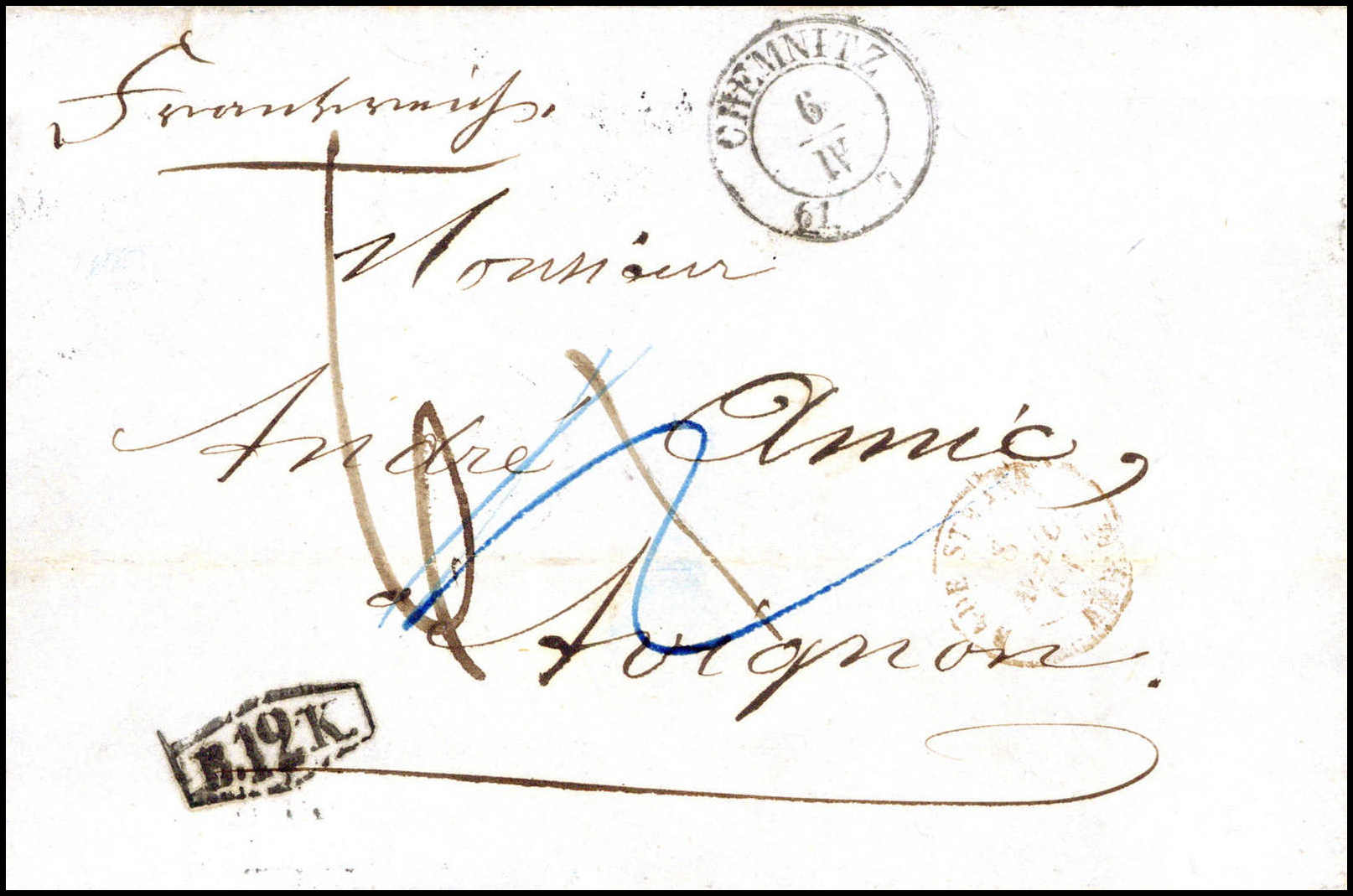 1861, "B. 12 K.", Taxstempel klar auf Kabinettbrief von Chemnitz nach Frankreich