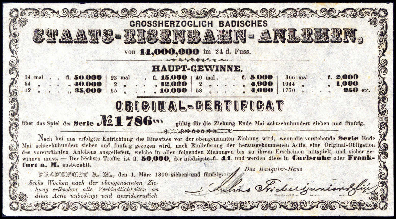 1857 "Großherzoglich Badische Staats-Eisenbahn-Anlehen", Original-Certificat (Eisenbahn-Lotterie)