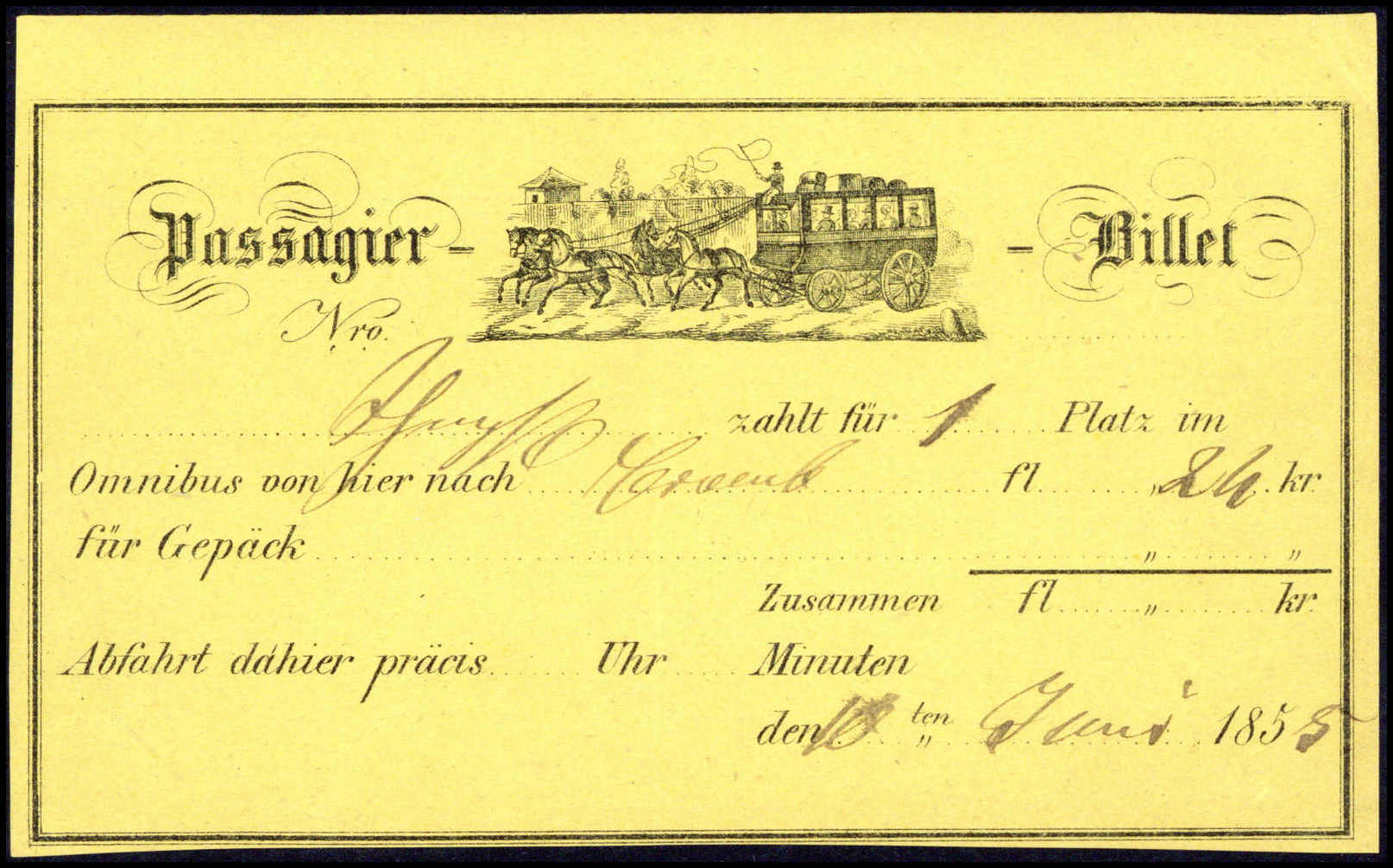 1855, Grüner Reiseschein "Passagier-Billet" mit Postkutschen-Abbildung