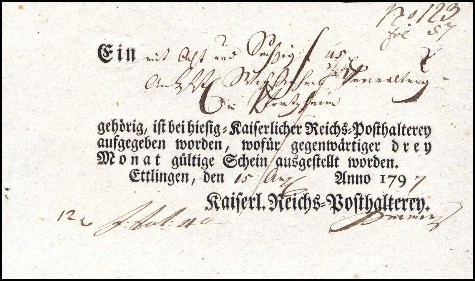 1797, Ettlingen, Postschein "Kaiserl. Reichs-Posthalterey"