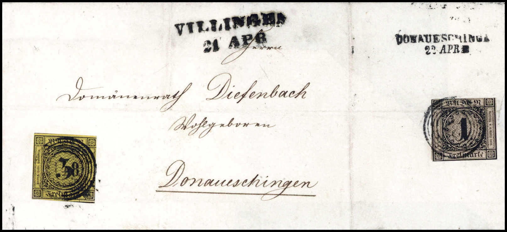 "148" entwertet, die rs. klebende 1 Kr. dort nicht entwertet, stattdessen erst am Empfangsort mit Stempel "27" und beiges. kleinem L2 DONAUESCHINGEN. Trotz kl. Mängel ein ganz außergewöhnlicher und seltener Brief, Fotoattest Stegmüller BPP. Katalogpreis: 4.500,-