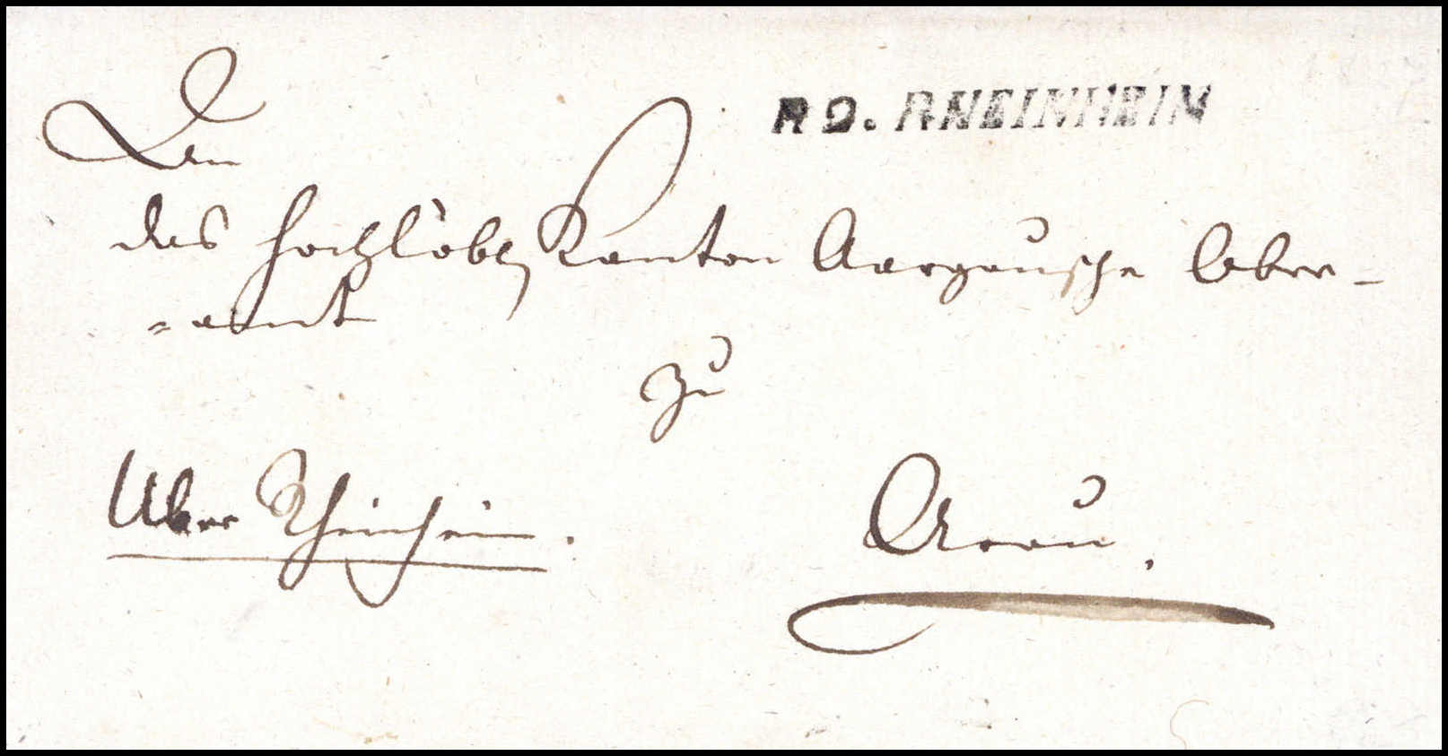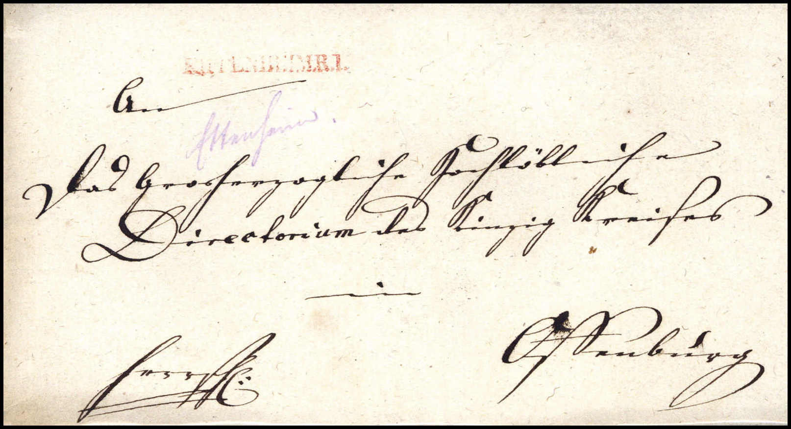 1821, ETTENHEIM, R1 in Rot klar auf kpl., vollständig datiertem Kabinettbrief nach Offenburg. Dieser Stempel ist bei Feuser nicht aufgeführt. Sehr selten