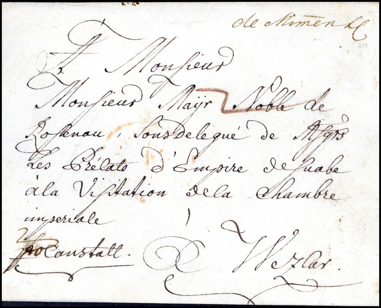 (1750), "de Mimenhs.", hs. Aufgabe auf Kabinett-Umschlag nach Wetzlar mit Leitvermerk "fr. Cannstatt", sign. Kruschel