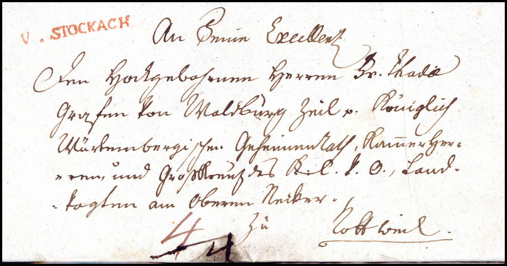 1813, V. STOCKACH R.II, roter L2 auf Kabinetthülle nach Radolfzell (Hb. 3449-12)