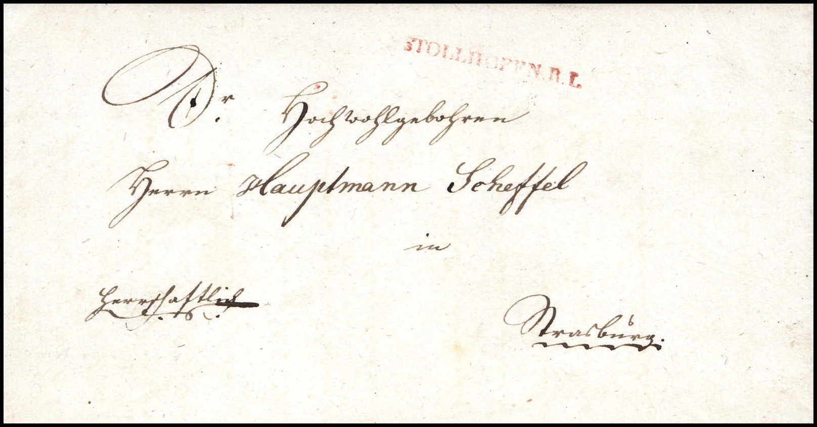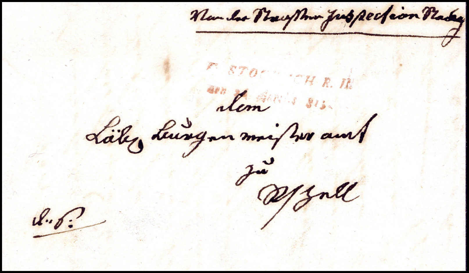 (1802) STOLLHOFEN R1, roter L1, besonders schön auf Luxusbriefhülle nach Straßburg. Wohl der schönste bekannte Abschlag dieser Stempel-Seltenheit (Hb. 800,-)