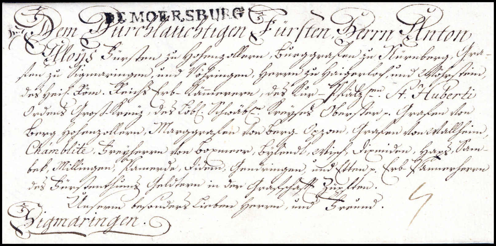 1787, DE MOERSBURG, L1, klar auf Luxusbrief an den Fürsten von Hohenzollern/Sigmaringen
