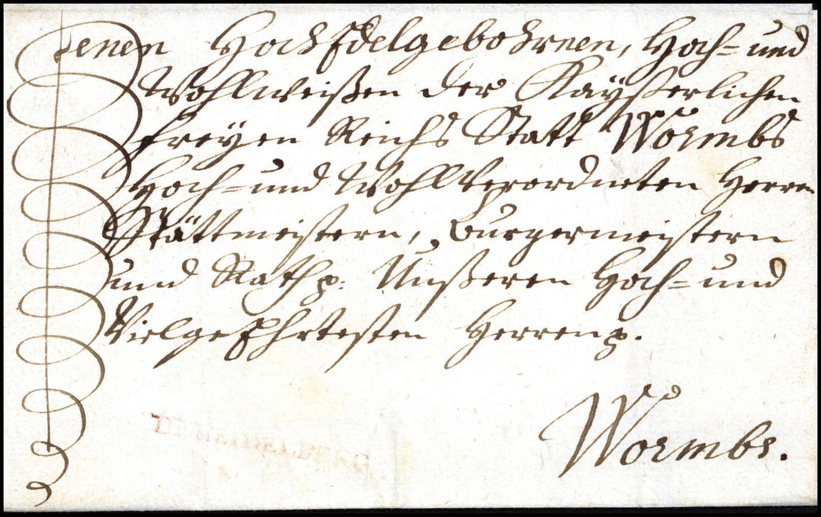 1733, DE HEIDELBERG, roter L1 auf dekorativem Schnörkelbrief mit innen erhalten gebliebener Datierung nach Worms. Prachtvolles Trockensiegel