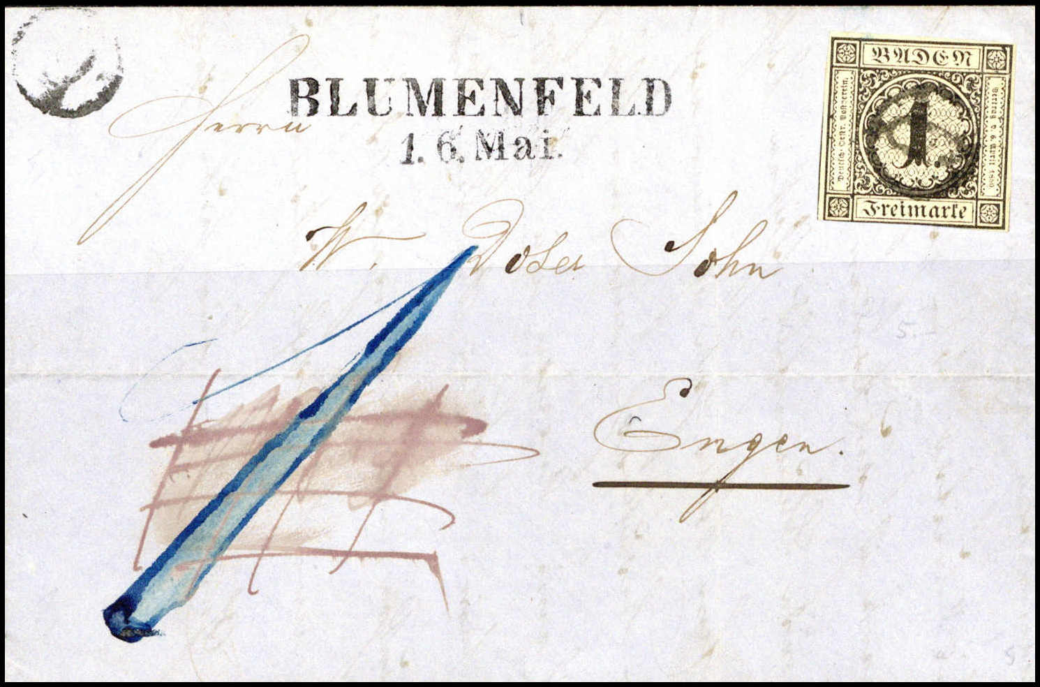 1 Kr. schwarz auf weiß, unten links berührt, sonst voll bis breitrandig, entwertet mit Nummernstempel "6", beiges. L2 BLUMENFELD 16. MAI (1860), nach Engen mit einer blauen "1" taxiert