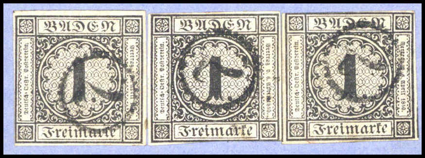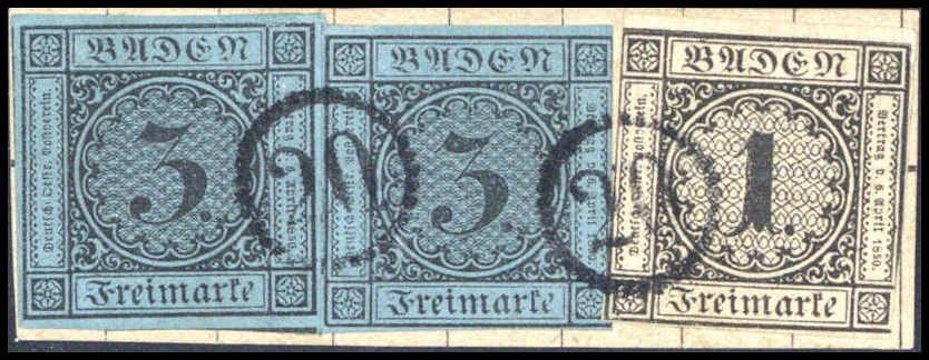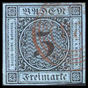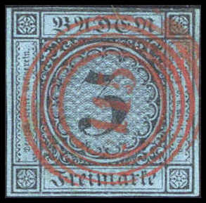 3 Kr., schönes Exemplar (etwas wolkiges Papier) mit sehr seltener Entwertung durch roten Nummernstpl. "28" DURLACH