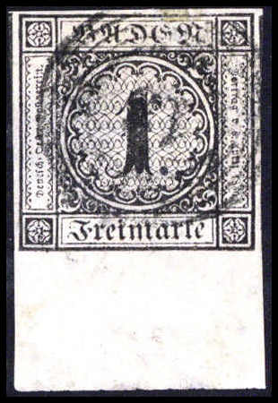 1 Kr., Abart: durchschlagender Druck, vorzüglich geschnittenes Exemplar mit breitem unterem Bogenrand und zentr. Stempel "13" TAUBERBISCHOFSHEIM. Trotz kl. Beanstdg. ein außergewöhnliches Stück