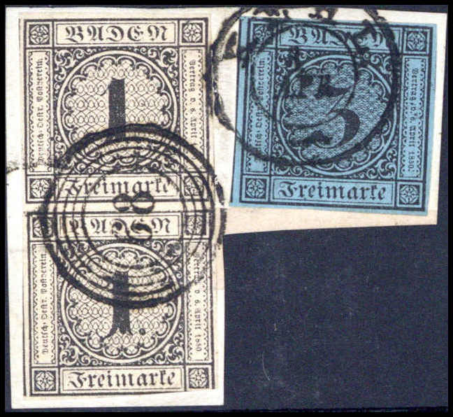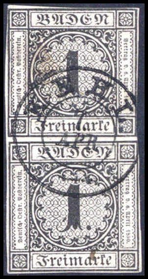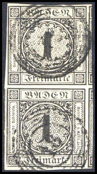1 Kr., waagr. Paar, re. unten etwas berührt, mit deutlicher Klischeeverschiebung, zentr. Stempel "123" ST. BLASIEN. Selten, Fotobefund Brettl