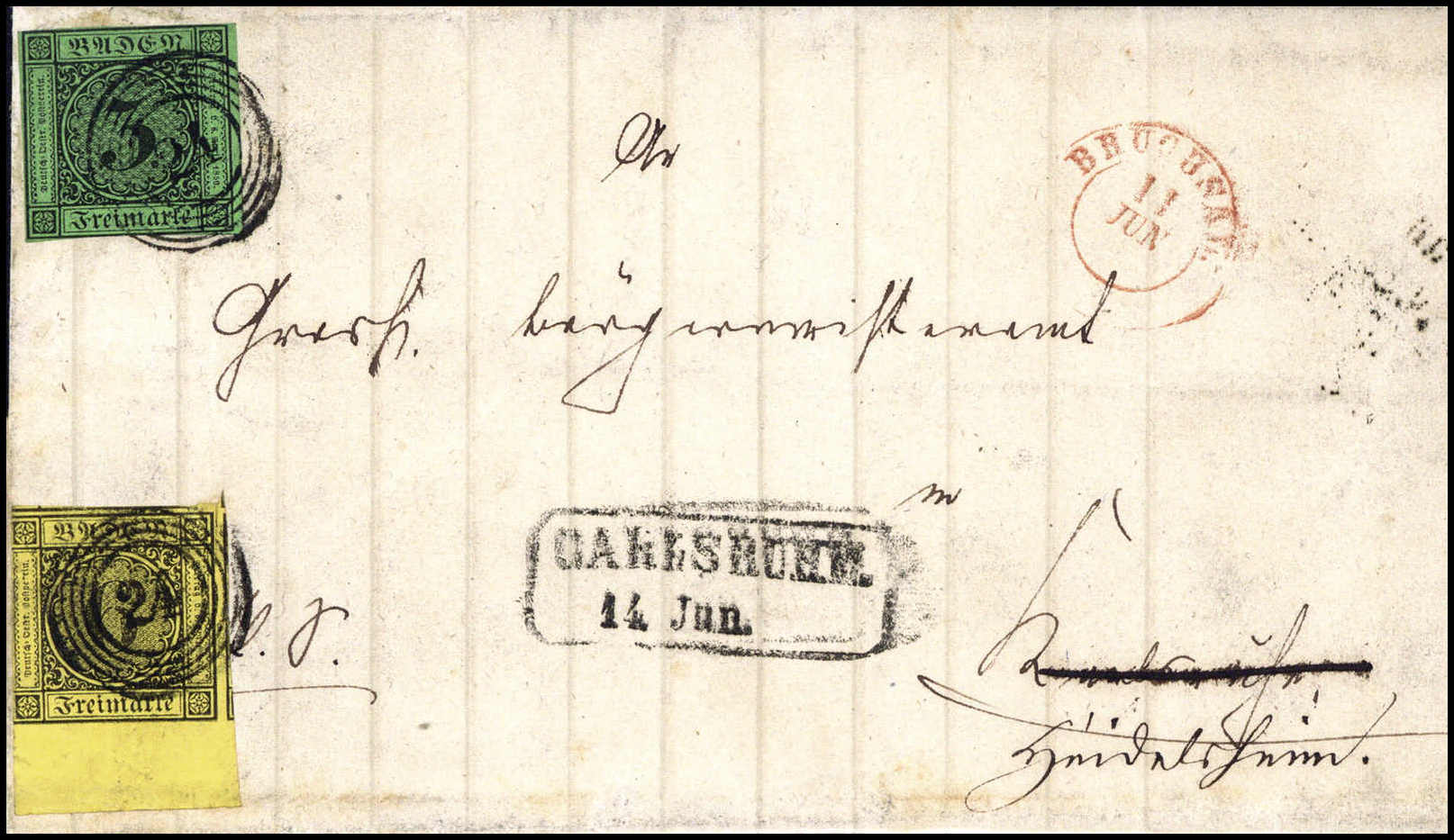 3 Kr. mit großem Unterrandstück 6 Kr. a. gelb, üblich geschn. auf schönem Nachsendebrief mit klaren Stempeln "24" CARLSRUHE