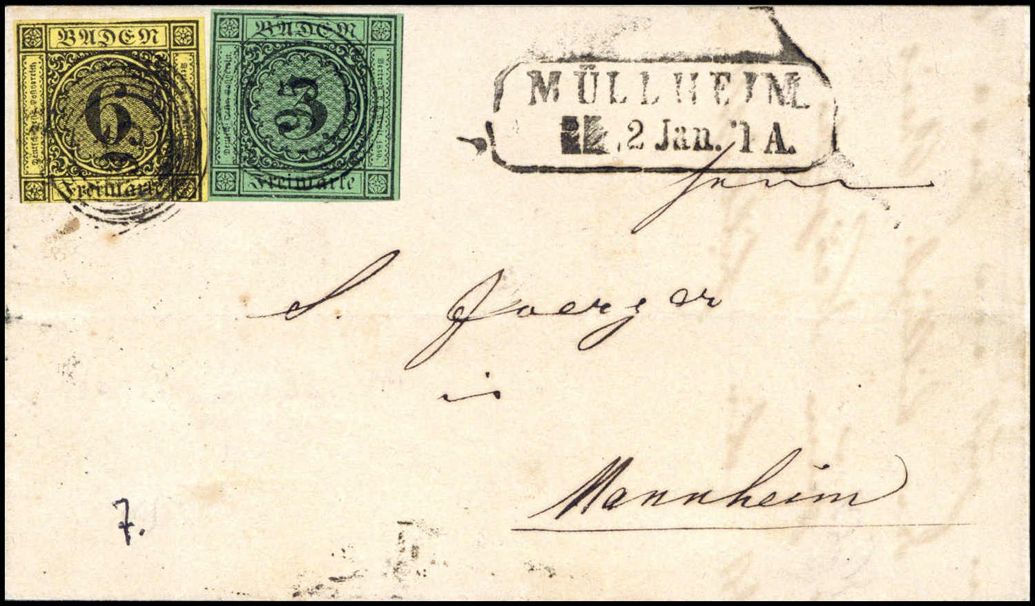 3 Kr., Luxusstück mit leicht berührter 6 Kr. a. gelb auf schönem Brief von Müllheim nach Mannheim