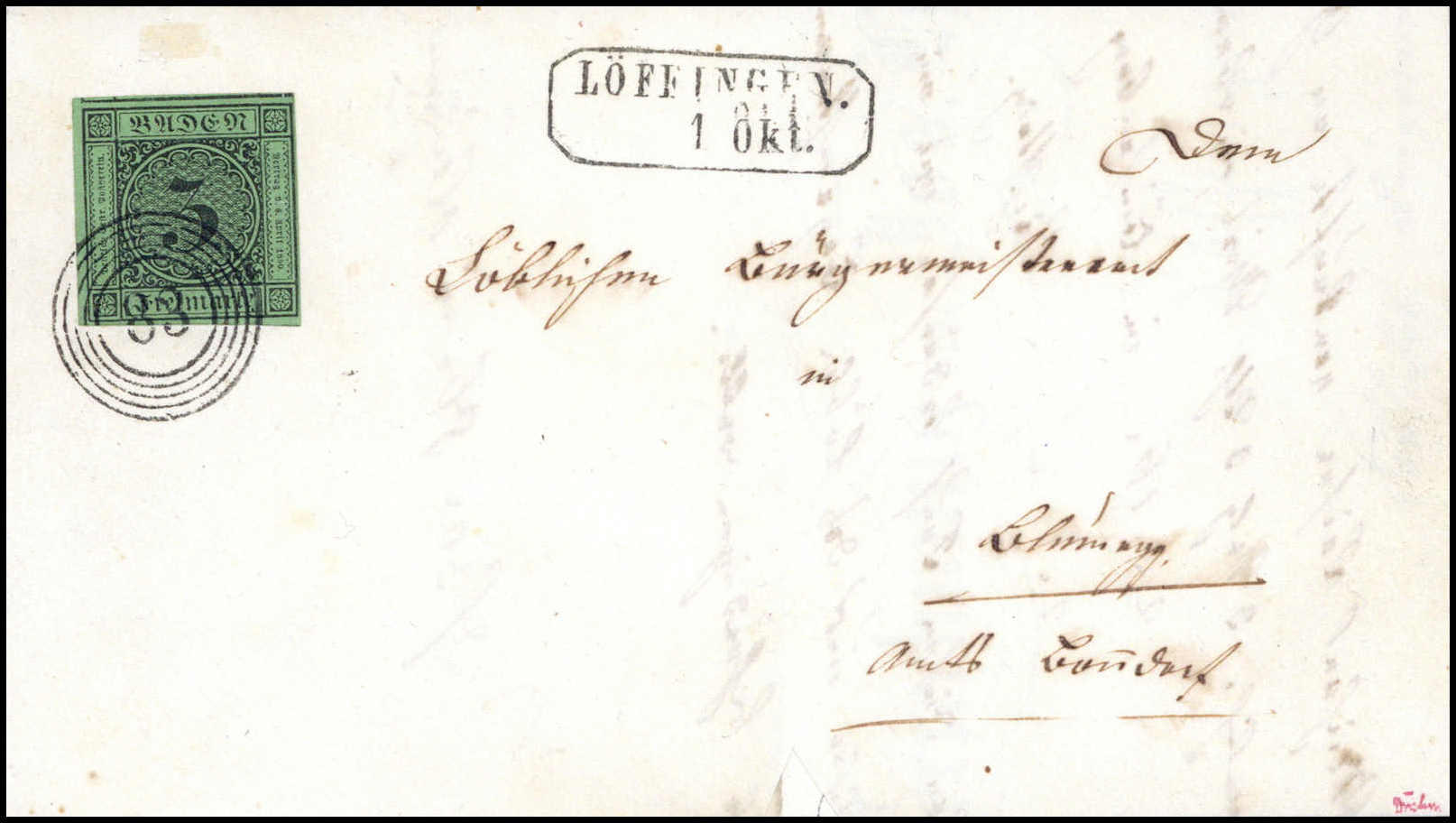 3 Kr., voll- bis überrandige Luxus-Einzelfrankatur mit gestochen klarem Stempel "83" LÖFFINGEN auf Brief nach Bondorf, sign. Drahn