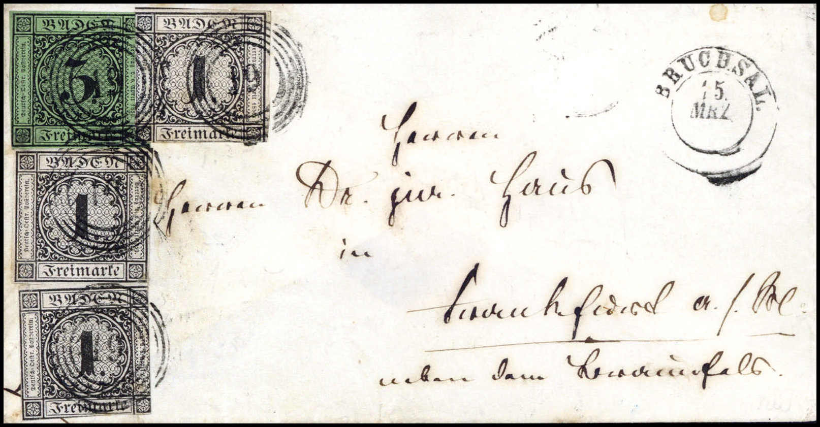 1 Kr., drei Exemplare mit 3 Kr. a. grün auf schönem weißem Kuvert von Bruchsal nach Frankfurt/M. Trotz kl. Beanstdg. eine interessante Frankatur