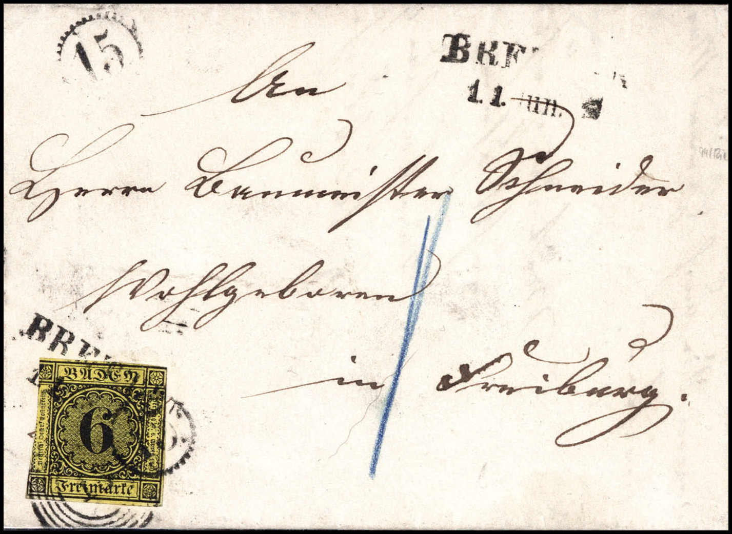 Dreifach-Entwertung: 6 Kr., li. angeschnittene Einzelfrankatur auf sauberem Brief von Kürnbach nach Freiburg. Zunächst entwertet durch Uhrradstempel "15", später mit Nummernstpl. "18" und zusätzl. L2 BRETTEN. Ein außergewöhnlicher Brief