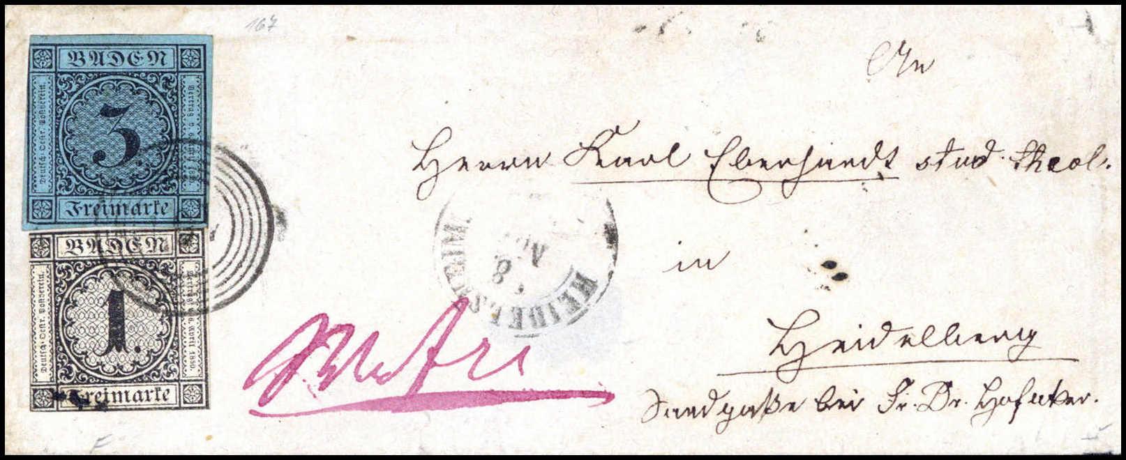 1 und 3 Kr., frische, übl. geschnittene Exemplare auf kl. Kuvert mit Stempel "167" HEIDELSHEIM