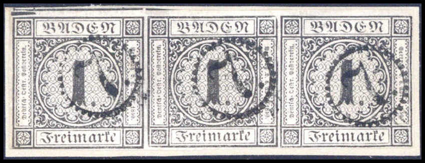 1 Kr., vollrandiger, waagr. Dreierstreifen (oben Teile der Nebenmarken inkl. dickem Druckspieß im Zwischenraum), zentr. Uhrrandstempel "7"