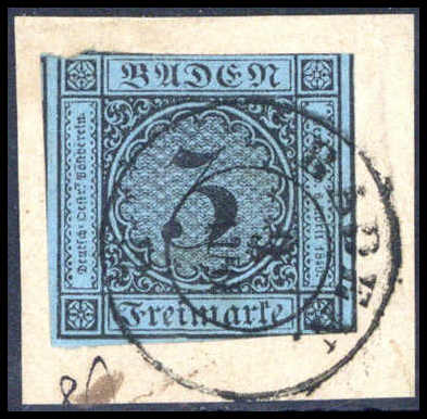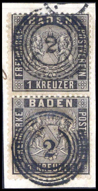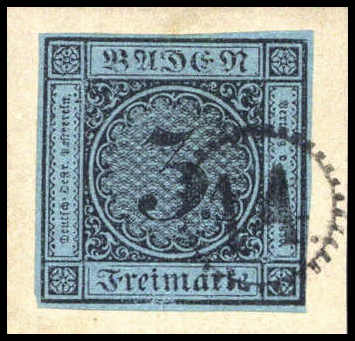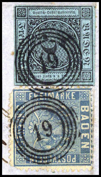 3 Kr., Mischfrankatur mit 3 Kr. preussischblau (übliche Zf.) auf schönem Bfstk. mit zentr. und gestochen klaren Stempeln "19" BRUCHSAL. Eine extrem seltene Frankatur-Kombination, sign. Englert BPP