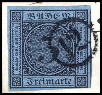 3 Kr., frisches Briefstück (üblicher Schnitt) mit seltener Entwertung durch idealen Orts-K2 BADEN