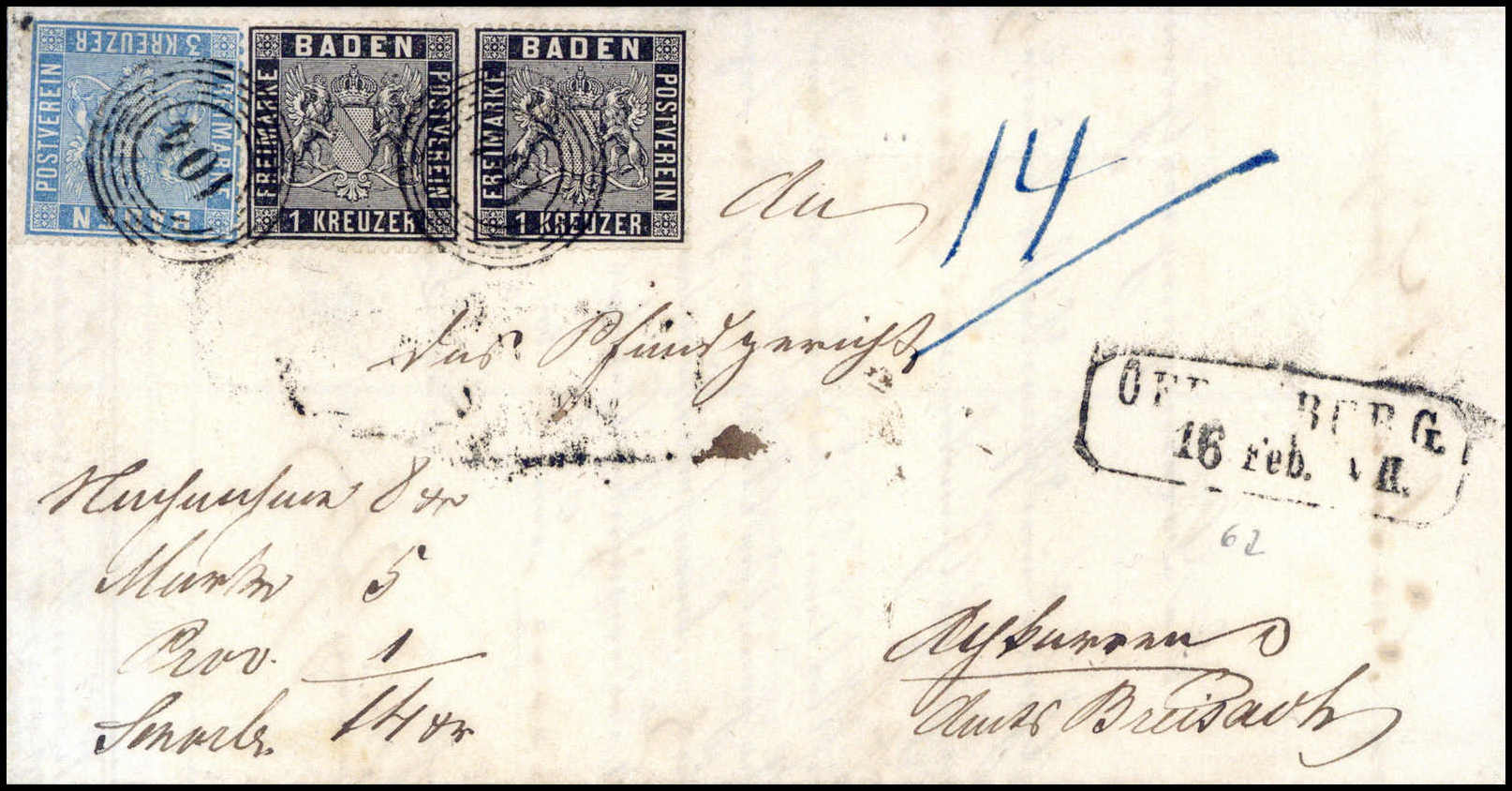 1 Kr., waagr. Paar mit 3 Kr. preussischblau, meist gut gezähnte 5-Kr.-Frankatur auf schönem Nachnahmebrief von Offenburg nach Breisach